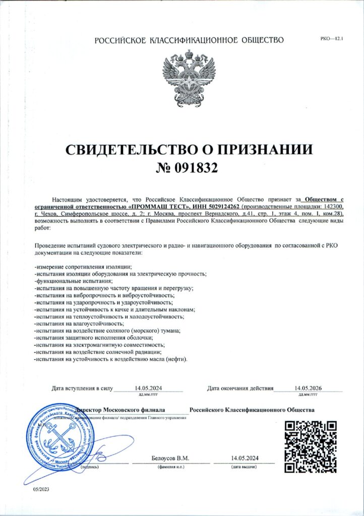 Свидетельство о признании лаборатории Российским Классификационным Обществом№ 091832 -